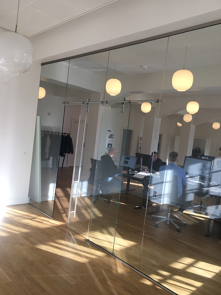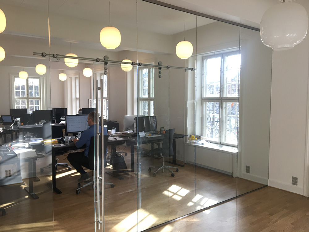 Flot og effektiv afskærmning af bl.a. kontorer med en skillevæg i glas. En skillevæg har mange fordele: Den afskærmer effektivt mod lyd, lækkert design og den får rummet til at virke større.
